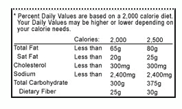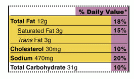 | Next come nutrients that we typically eat plenty (or too much!) of. What matters here? A healthy eating style limits fat, cholesterol, and sodium (salt). The % Daily Value column is your “cheat sheet.” If the column shows 5% or less, the food is low in fat, or cholesterol, or sodium. If the column shows 20% or more, the food is high in fat, cholesterol, or sodium. |